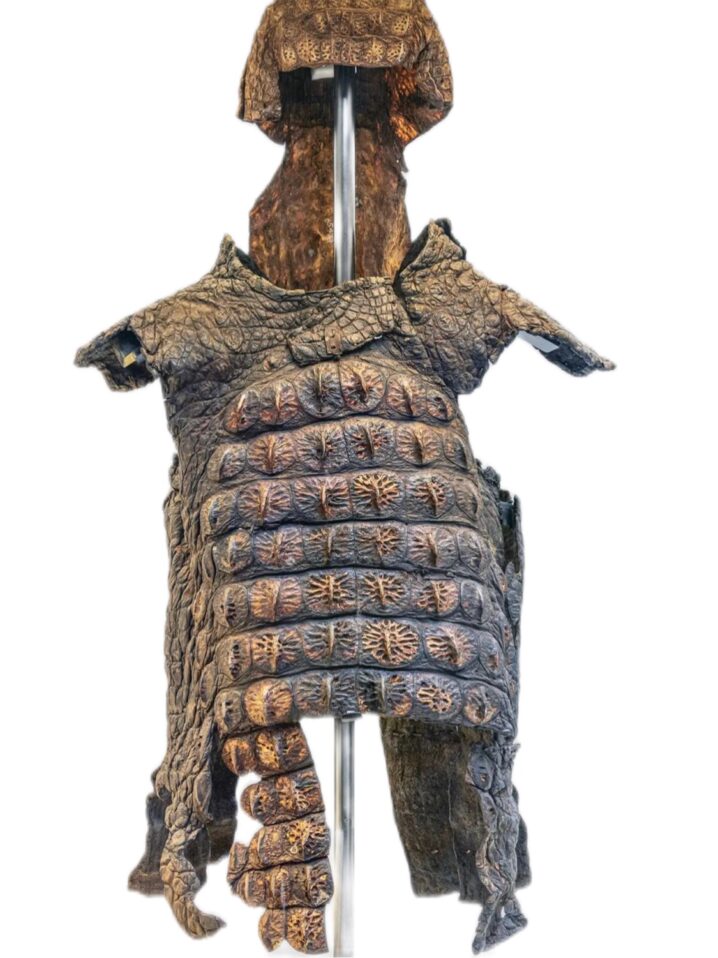 ワニ皮は硬く、加工が容易ではないにもかかわらず胸当てや兜として成形するには高度な技術が必要だったでしょう。