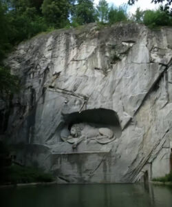 1821年に完成したライオン記念碑はデンマークの巨匠ベルテル・トルヴァルセンの設計によりルツェルンの石工ルーカス・アホルンが自然の岩壁に直接彫り込んだ傑作である。