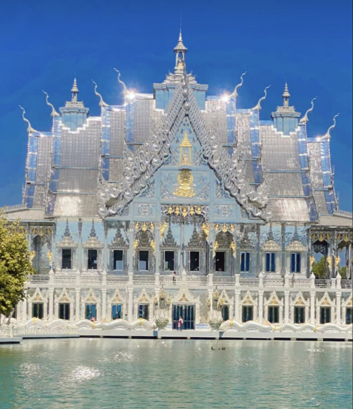 この寺院はチャチョエンサオ県の穏やかな田園地帯を流れるバンパコン川の、まさに中洲に築かれている。寺院の通称は「シルバー寺院」あるいは「ガラス寺院」この名が示す通り本堂は外壁から内部の柱、天井に至るまで無数の鏡と銀色・透明のガラスモザイクで覆われており、わずかな光が無数の断片に反射して水の上に浮かぶ建築全体がきらめく宝石の箱のように輝く。この輝きは仏教における「知恵の光」や「清浄さ」の視覚的表現であると同時に訪れる者に非日常的で幻想的な空間体験をもたらす。