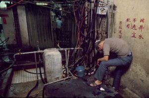 驚くべきことに、これだけ無茶な建築でありながら城砦内で大規模な倒壊は一度も起きなかった。あまりに密に建物が寄り添い支え合っていたため一種の「三次元構造体」として機能していたのである。香港政府は正式には城砦に電力を供給していなかった。しかし実際には多くの世帯が電灯を使っていた。その正体は街灯からの「盗電」住民はプロの電気技師(もちろん無資格)を雇い外の街灯からケーブルを引き込んだ。その結果、城砦の上空は「スパゲッティのようになった電線」が覆い停電は日常茶飯事だった。もっと深刻だったのが水だ。城砦には本来、公共水道が存在しない。わずかに数本の「街喉(がいこう)」と呼ばれる公用水栓が設置されていたが、これらは完全にギャングの支配下にあった。
