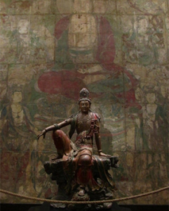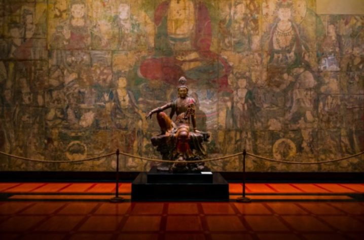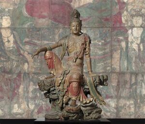 その衣文(えもん)の流れるような曲線を見てほしい。布は重たげでありながら、風にたなびくような軽やかさをも兼ね備えている。胸元の装飾、腕輪、そして台座の蓮華。すべてのディテールが、ただの木の塊を神性を宿す器へと変えている。そして、その眼差しは永遠に何かを見つめている。それはこの部屋の来館者かもしれない。あるいは壁画の彼方に広がる宇宙かもしれない。アメリカの地で、この観音は何を思うか。故郷の中国山西省の山々は、もはや遠い過去の記憶か。それとも仏の目には国境も民族も人の作った幻想に過ぎないのか。